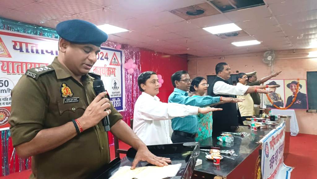 झाँसी | यातायात माह 2024 के क्रम में बुंदेलखंड महाविद्यालय के स्वर्ण जयंती सभागार में यातायात जागरूकता विषयक सेमिनार व शपथ ग्रहण का कार्यक्रम क्षेत्राधिकारी यातायात आलोक कुमार अग्रहरि के मुख्य आतिथ्य व बी.के.डी के प्राचार्य प्रोफेसर एस.के. राय की अध्यक्षता में किया गया।