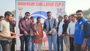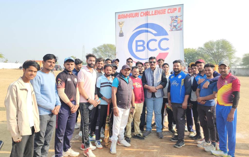 झाँसी। जनपद के मऊरानीपुर स्थित बम्होरी में स्वतंत्रता संग्राम सेनानी मोतीलाल नायक ग्रीन पार्क स्टेडियम में बम्होरी चैलेंज कप का आयोजन किया गया, यह अंतर्जनपदीय टेनिस बॉल क्रिकेट प्रतियोगिता का द्वितीय आयोजन है। इस प्रतियोगिता के प्रथम दिवस पर उद्घाटन मैच में मुख्य अतिथि के रूप में जनपद के प्रतिष्ठित समाजसेवी डॉ० संदीप सरावगी एवं विशिष्ट अतिथि के रूप में बृजेश नामदेव एवं संदीप नामदेव उपस्थित रहे। मुख्य अतिथि के आगमन पर माल्यार्पण, तिलक एवं स्मृति चिन्ह देकर स्वागत किया गया तत्पश्चात डॉ० संदीप ने दोनों टीमों से हाथ मिलाकर उनका उत्साहवर्धन किया गया।
