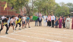 अतिथियों के आगमन पर तिलक व माल्यार्पण कर उनका स्वागत किया गया तत्पश्चात मुख्य अतिथि द्वारा मशाल प्रज्वलित कर खेलों की शुरुआत की गई।
